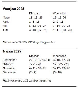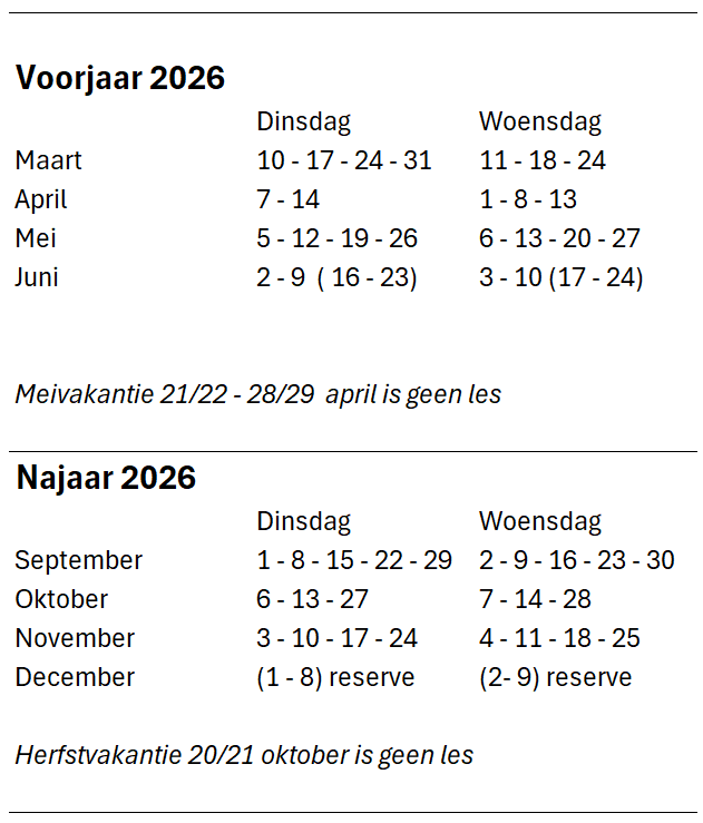 * Om deel te nemen aan de lessen moet je lid zijn van onze club. Je kunt je inschrijven via de knop 'Lid worden?' rechtsboven op de pagina. Als je je na juli aanmeldt voor een lidmaatschap, wordt een halfjaarabonnement in rekening gebracht.